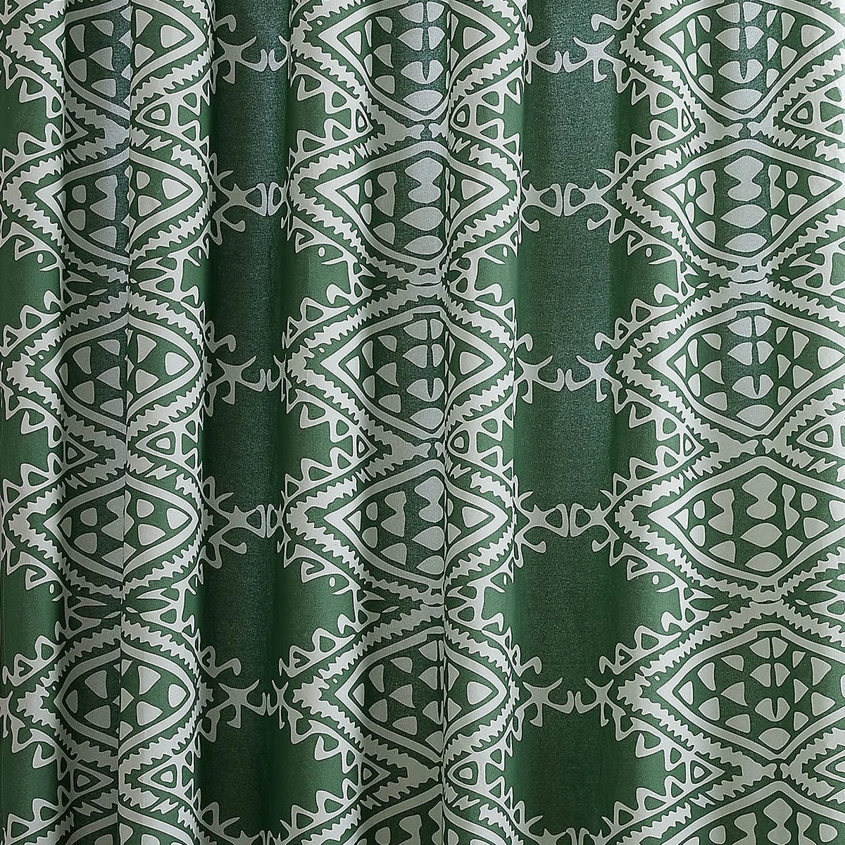 Our Aisha shower curtain features a gorgeous geometric pattern that is inspired by the motifs found on various vintage textiles. The mellow shade of sage green is accented with a soft, pale gray for the ultimate evergreen color combo.