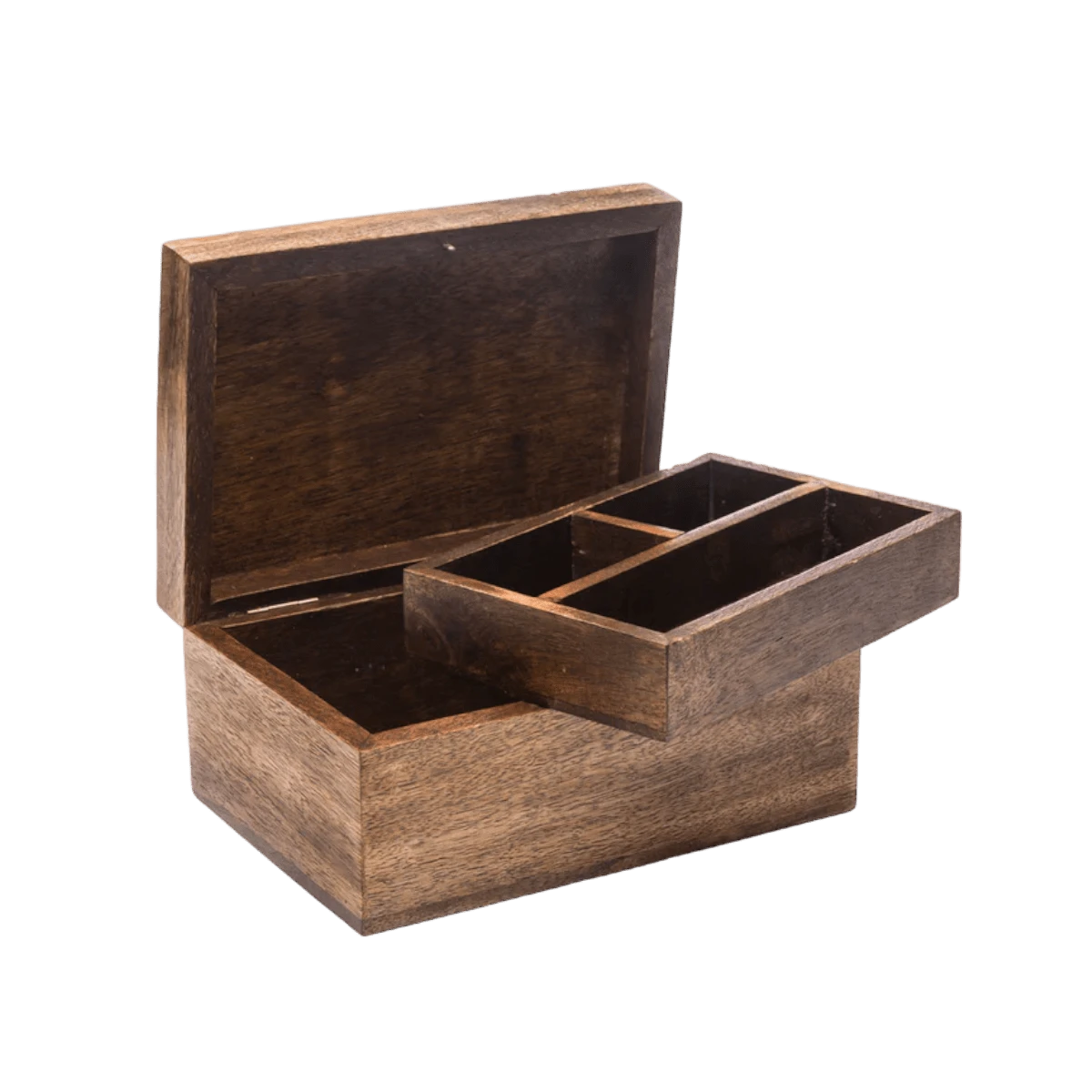 Ethically sourced mango wood box and hand carved tree of life design honoring Forest Goddess Aranyani. Store keepsakes neatly organized in this sustainably handmade jewelry box, with removable three compartment tray inside. Versatile gift for people for a variety of special occasions.