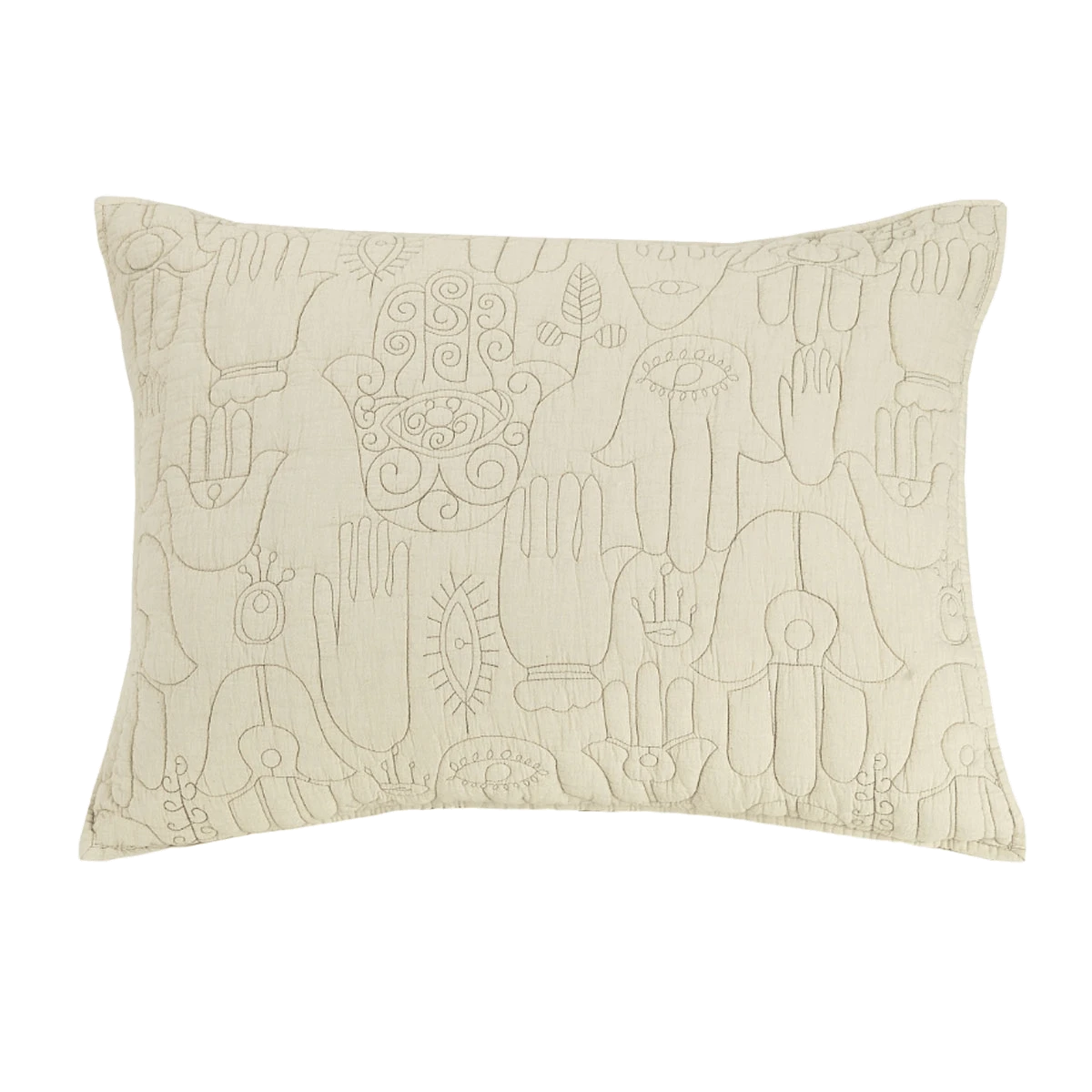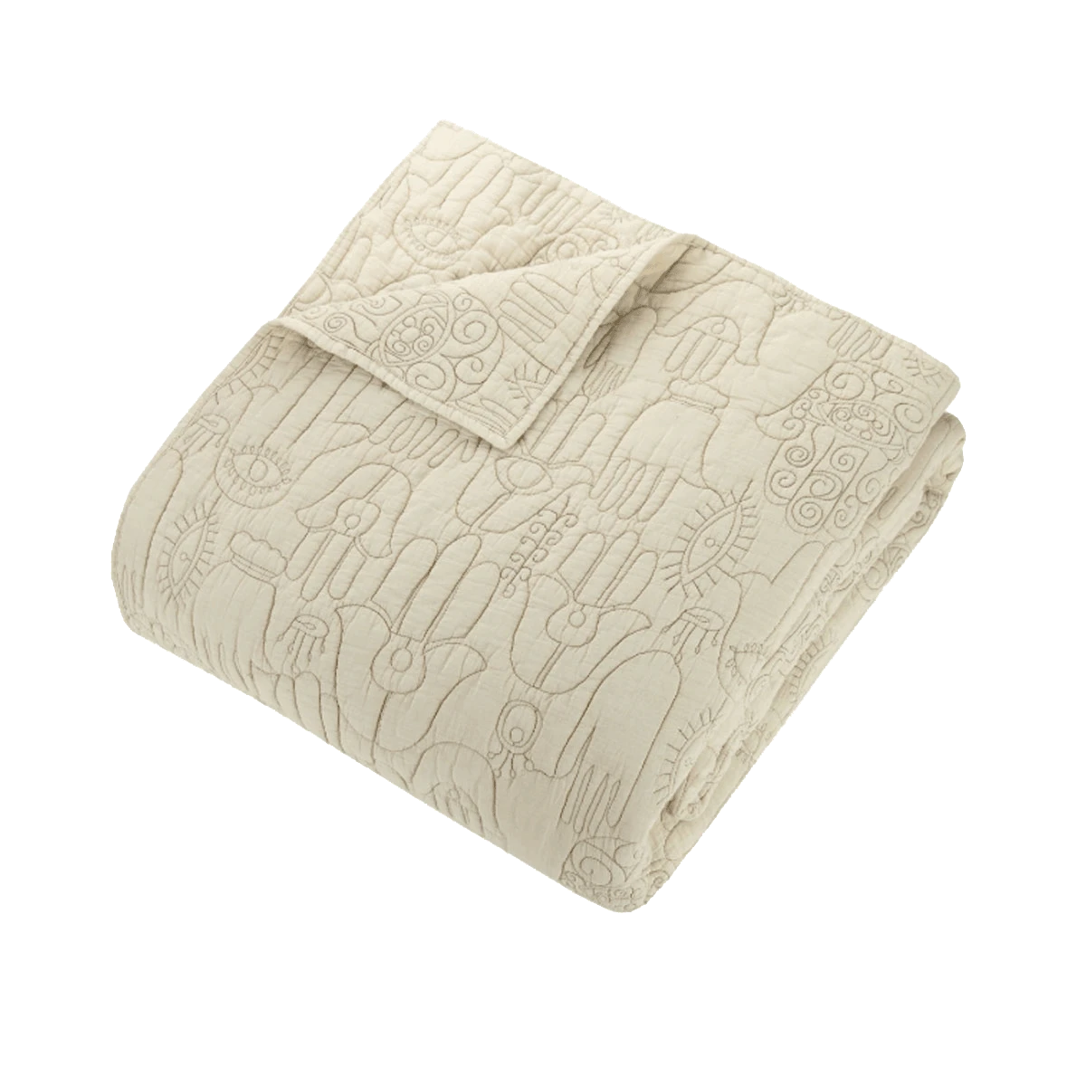 This mega-cozy quilt set is adorned with embroidered, hand-drawn illustrations of hamsas from Justina’s own hamsa amulet collection from her global escapades. The hamsa, also known as the Hand of God or the Hand of Fatima, is an ancient amulet symbolizing protection, happiness, luck, health and good fortune.
