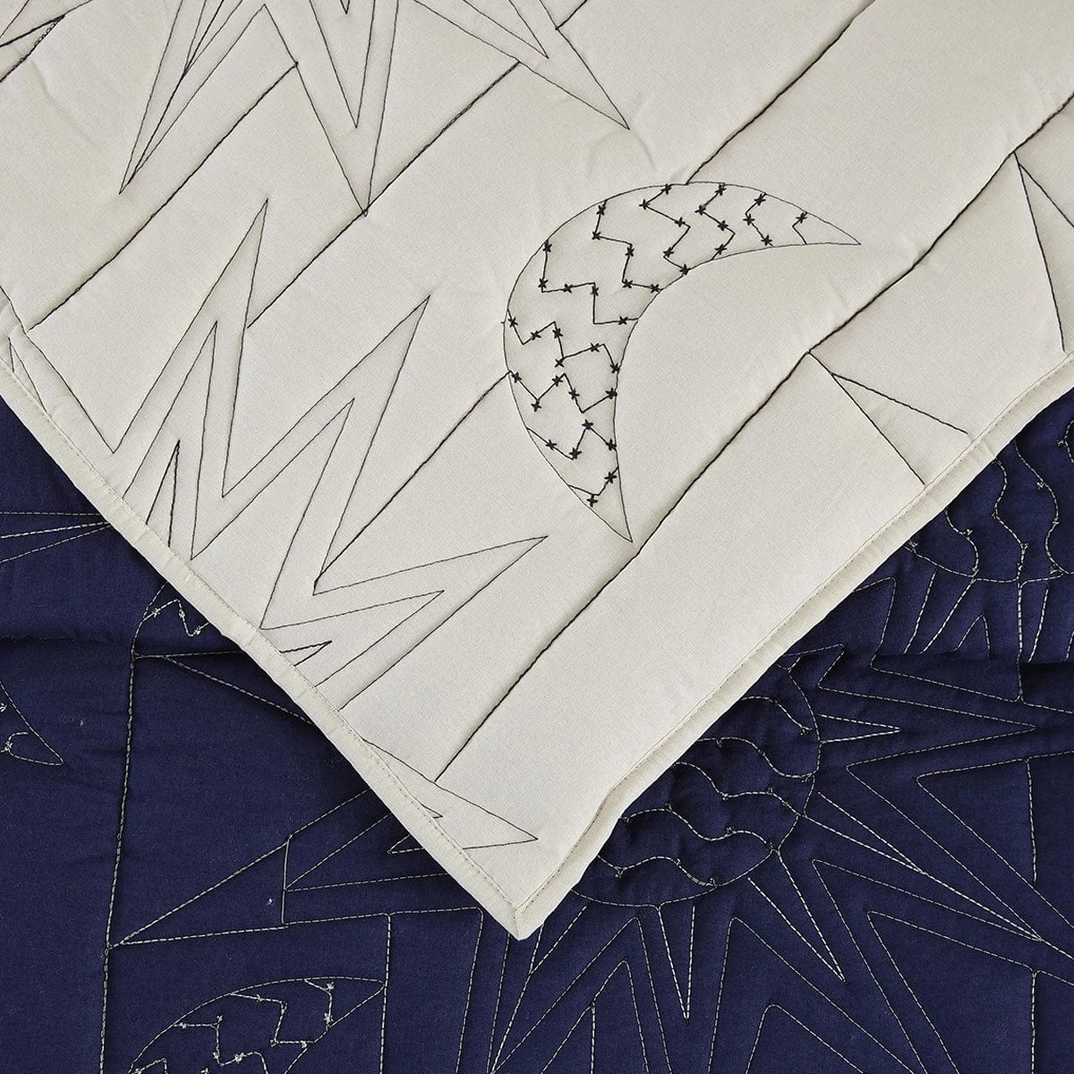 - Quilt has a natural color face with contrast blue stitching.